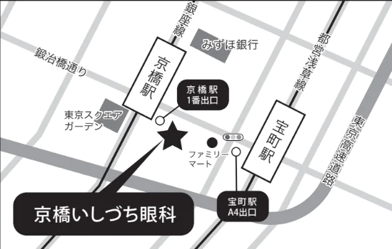 銀座線京橋駅1番出口から徒歩1分、都営浅草線宝町A4出口徒歩2分となります。