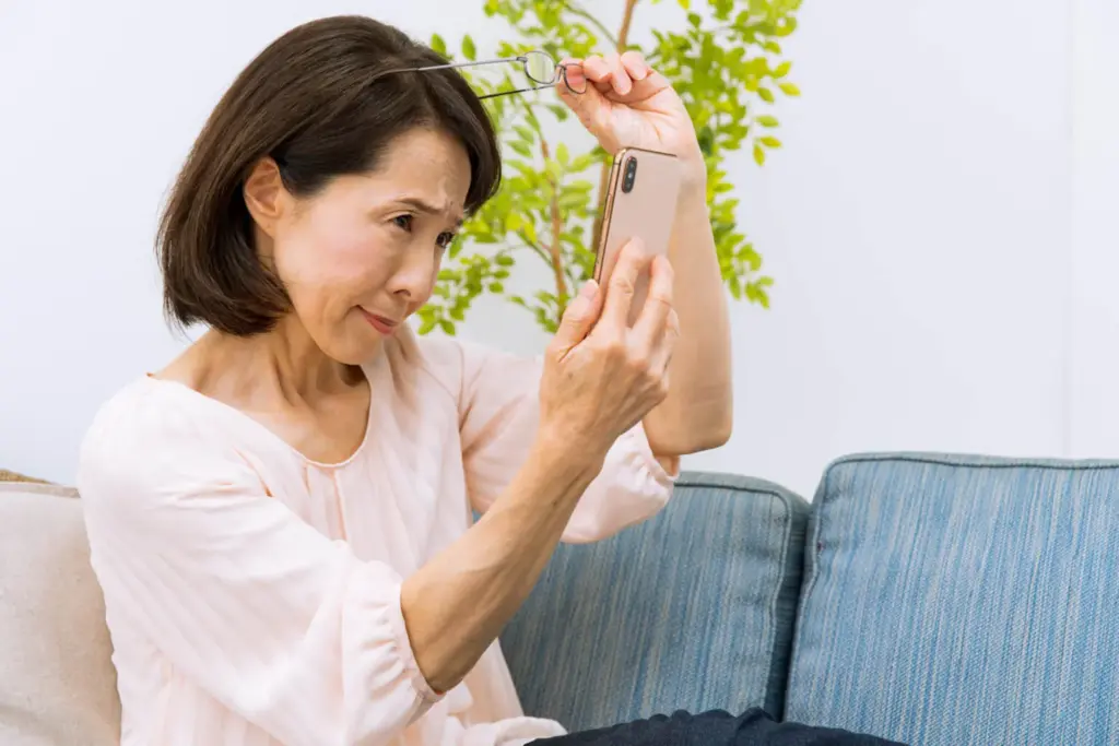 老眼とは、近くにある物が見えにくくなる状態です。加齢によって、ピントを調節する機能が衰えることで起こります。30代くらいから少しずつ症状が現れ、40代半ばから進行するのが特徴です。特に「遠くから近くの物へ視線をうつした時」「近くから遠くの物へ視線をうつした時」は、ピントの調節に時間がかかりやすい傾向があります。